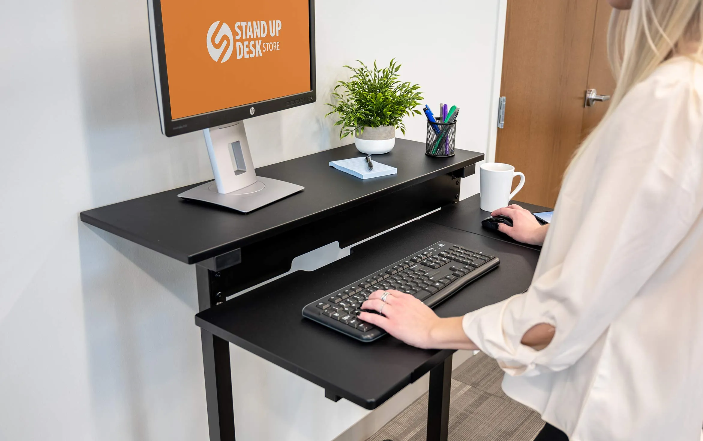 显示器放置的两级设计;平稳滚动、可锁定的脚轮,便于移动;电缆管理,保持电线整洁。