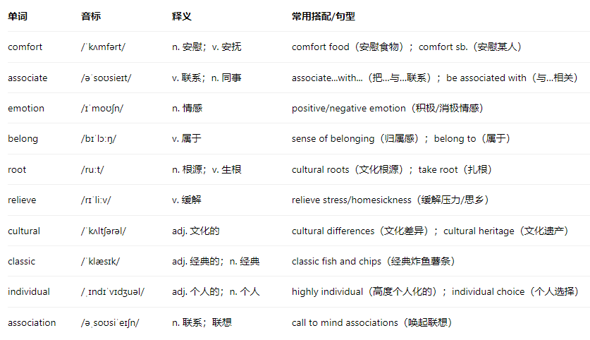 1 Text: Comfort Food二、常用单词(音标/释义/搭配/句型) 页面: 1 2 3 4 5 6 7 更多 5 综合知识点和练习 高二U1 3 Extended Reading: Eating in China