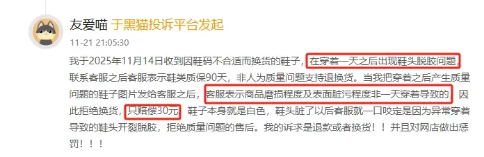 消费者反映收到New Balance鞋子后,仅穿着一天即出现鞋头脱胶问题。商家虽承诺鞋类质保90天,但在看到消费者提供的脱胶照片后,却以鞋面脏污为由判定为异常穿着,拒绝履行退换货义务,仅提出赔偿30元。消费者认为白色鞋体脏污与脱胶质量问题无关,现商家拒绝按质保售后。