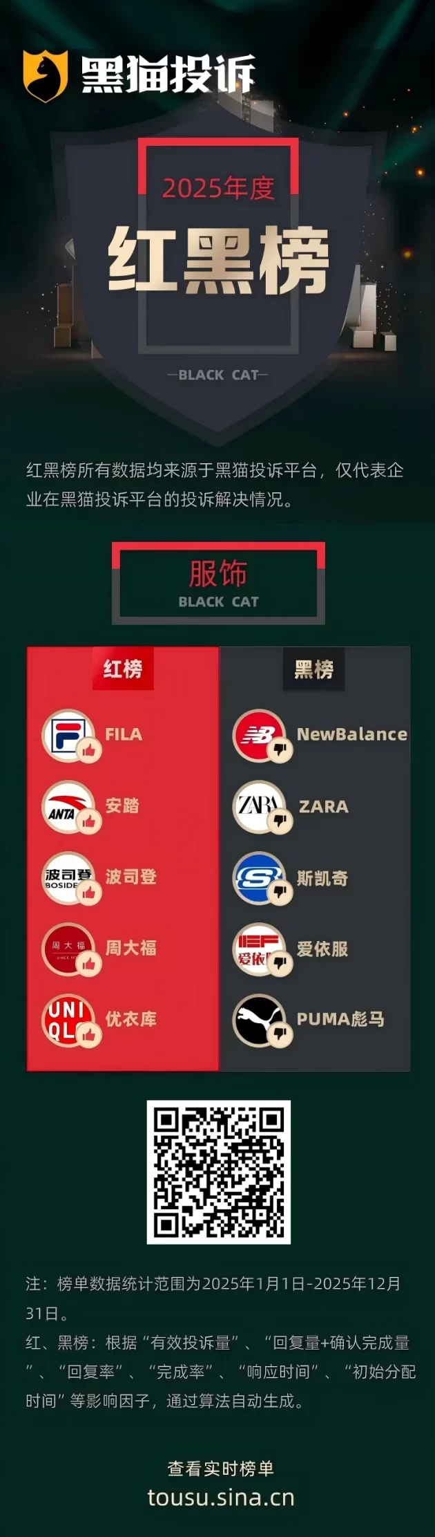 (新浪黑猫投诉 2026-03-09)黑猫投诉平台发布2025年度企业红黑榜榜单,涉及OTA、综合电商、汽车等21大领域,通过“有效投诉量”、“回复量+确认完成量”、“回复率”、“完成率”、“响应时间”、“初始分配时间”等多个维度的影响因子计算权重得出排行,客观反映企业2025年投诉处理情况。